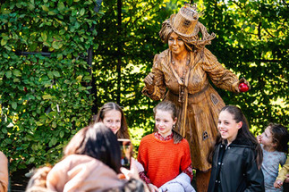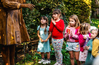 Een enthousiaste groep kinderen, vergezeld door hun ouders, trok ’s middags door het lichtgekleurd Engels Park. Daar waren ze getuige van een fascinerend schouwspel: drie levensechte standbeelden kwamen langzaam tot leven! Vertellers Monika Van Der Ree, Meneer Zee en Evi Rosiers kropen voor deze gelegenheid in de rol van respectievelijk een houten, een stenen en een bronzen beeld. Je kon hen nauwelijks onderscheiden van een echt beeld.